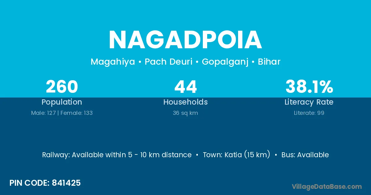 Katia (15 km) is the nearest town to Nagadpoia village for major economic activities and is located approximately 15 km away.
