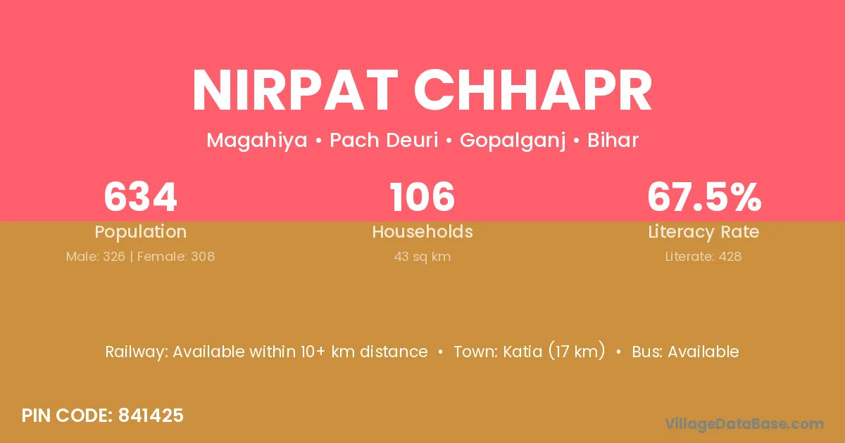 Katia (17 km) is the nearest town to Nirpat Chhapr village for major economic activities and is located approximately 17 km away.