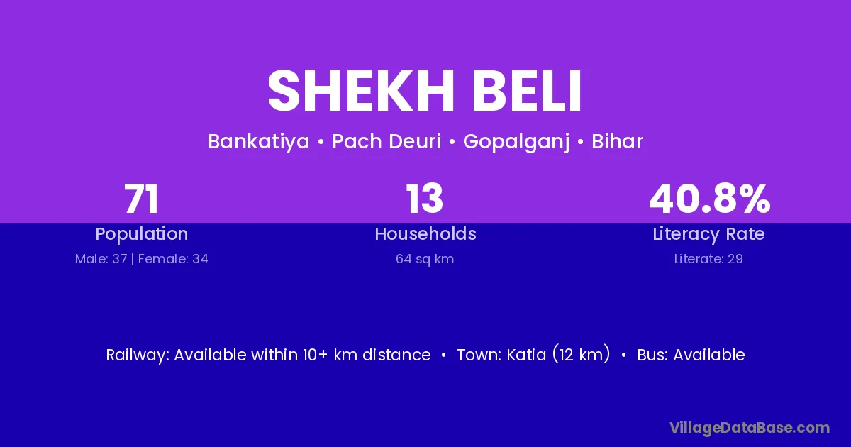 Katia (12 km) is the nearest town to Shekh Beli village for major economic activities and is located approximately 12 km away.