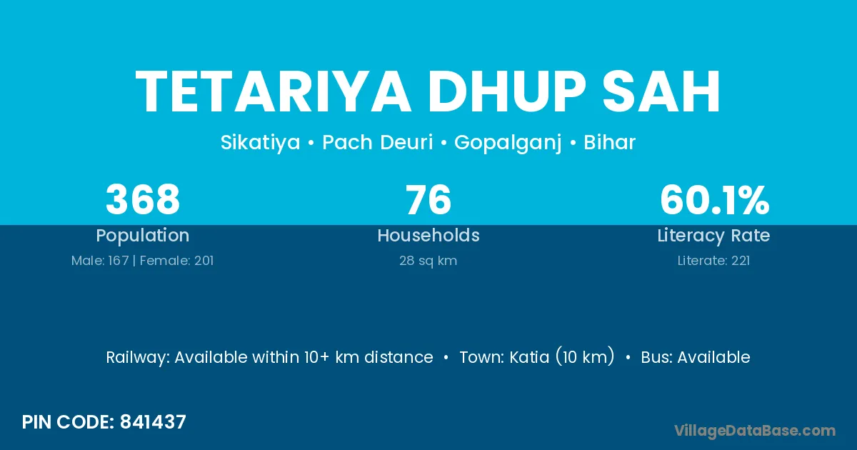 Katia (10 km) is the nearest town to Tetariya Dhup Sah village for major economic activities and is located approximately 10 km away.