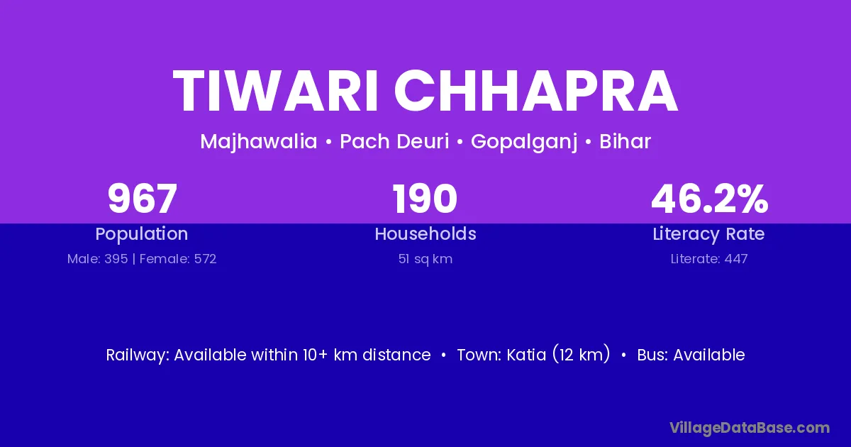 Katia (12 km) is the nearest town to Tiwari Chhapra village for major economic activities and is located approximately 12 km away.