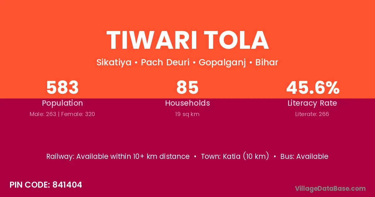 Katia (10 km) is the nearest town to Tiwari Tola village for major economic activities and is located approximately 10 km away.