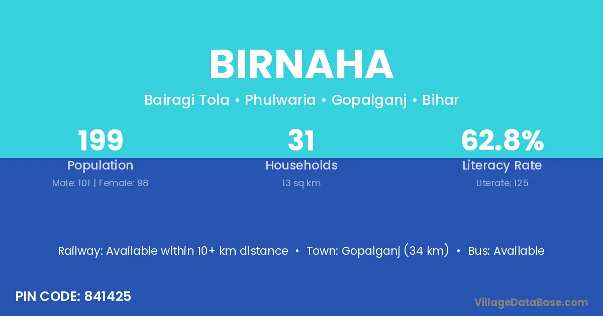Gopalganj (34 km) is the nearest town to Birnaha village for major economic activities and is located approximately 34 km away.