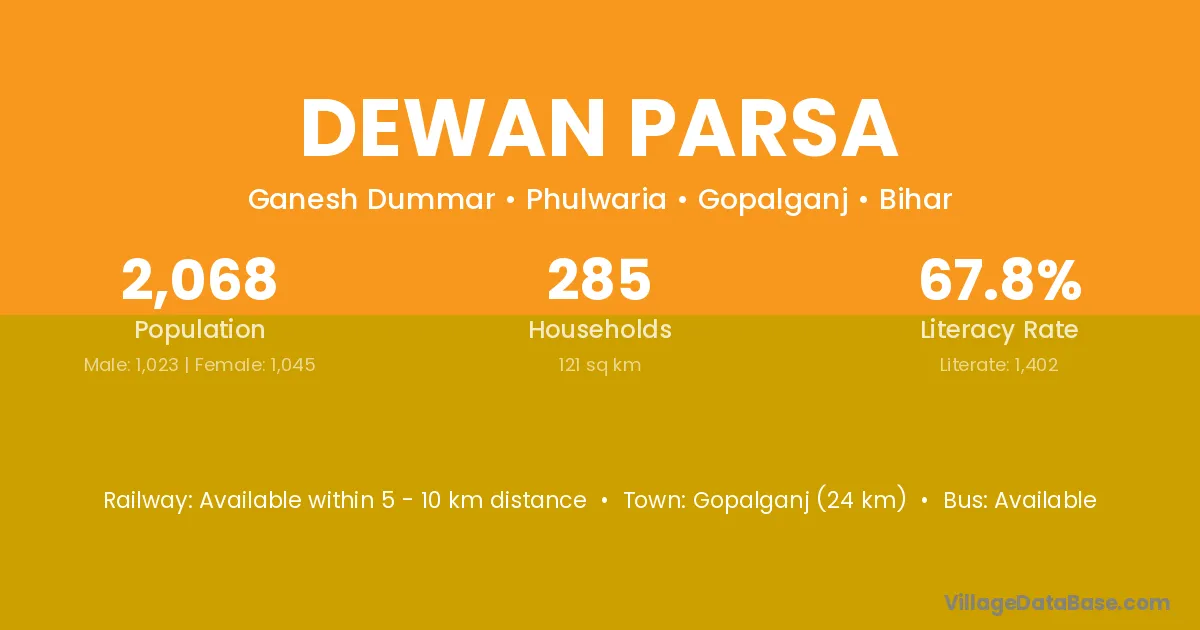 Gopalganj (24 km) is the nearest town to Dewan Parsa village for major economic activities and is located approximately 24 km away.