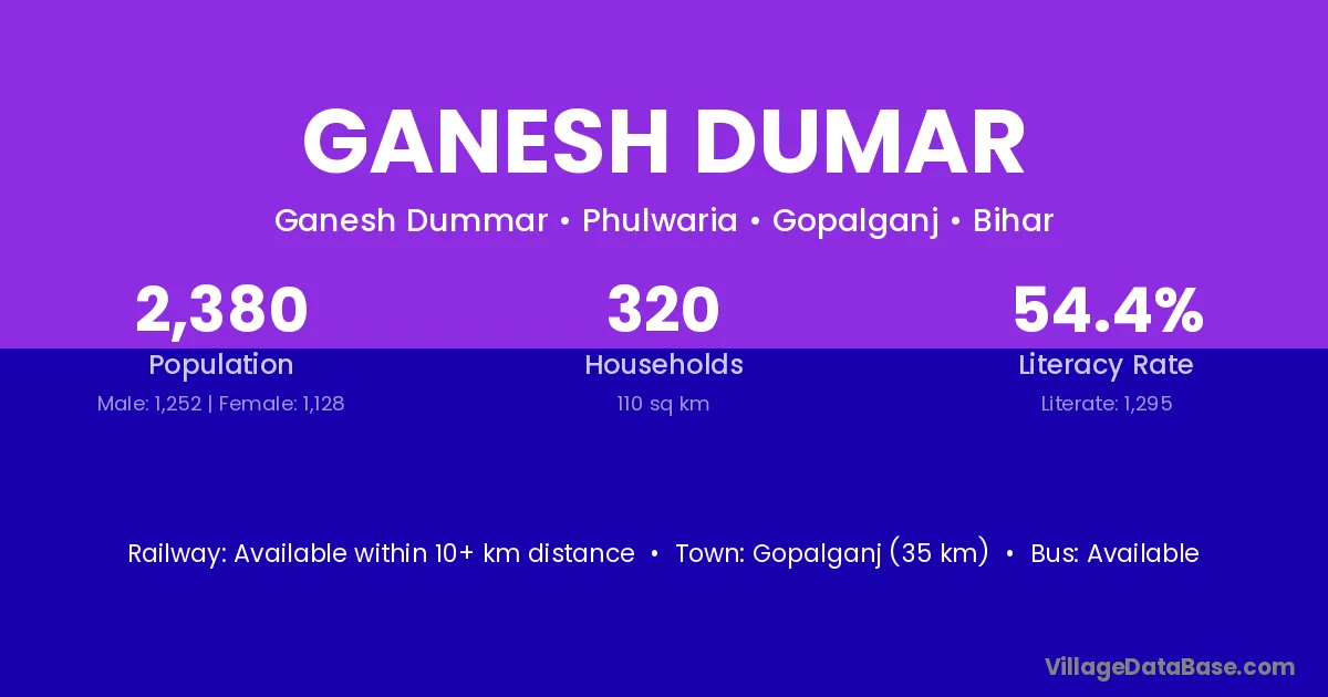 Gopalganj (35 km) is the nearest town to Ganesh Dumar village for major economic activities and is located approximately 35 km away.