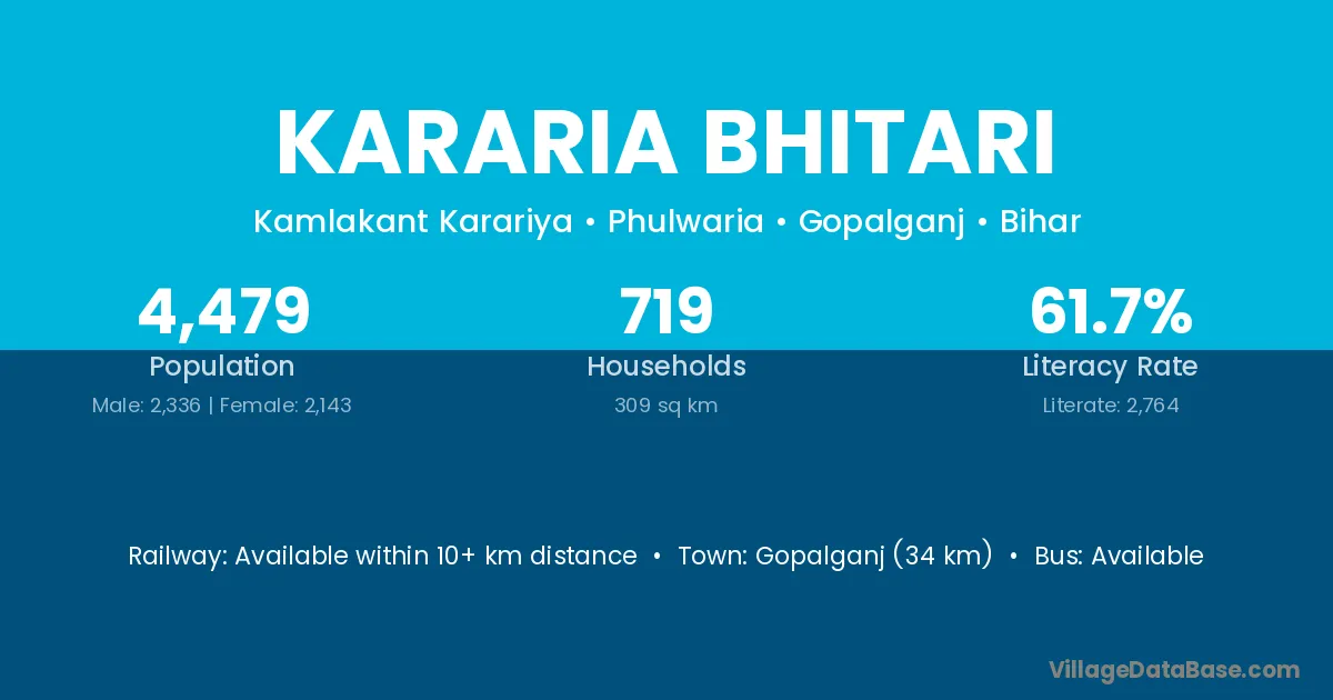 Gopalganj (34 km) is the nearest town to Kararia Bhitari village for major economic activities and is located approximately 34 km away.