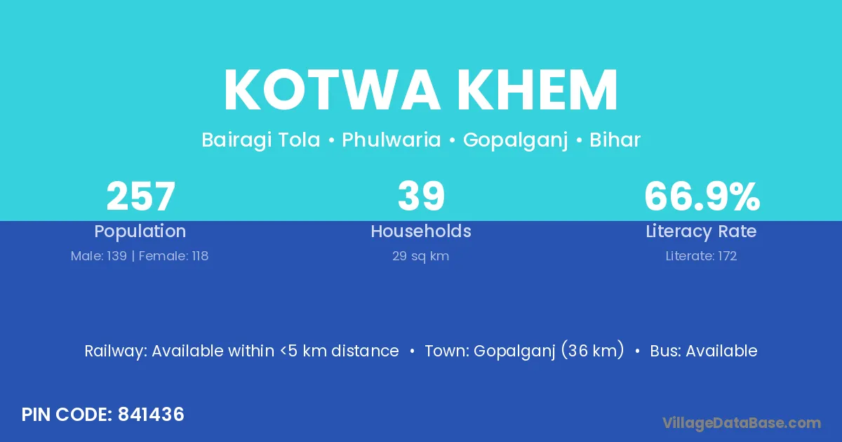 Gopalganj (36 km) is the nearest town to Kotwa Khem village for major economic activities and is located approximately 36 km away.