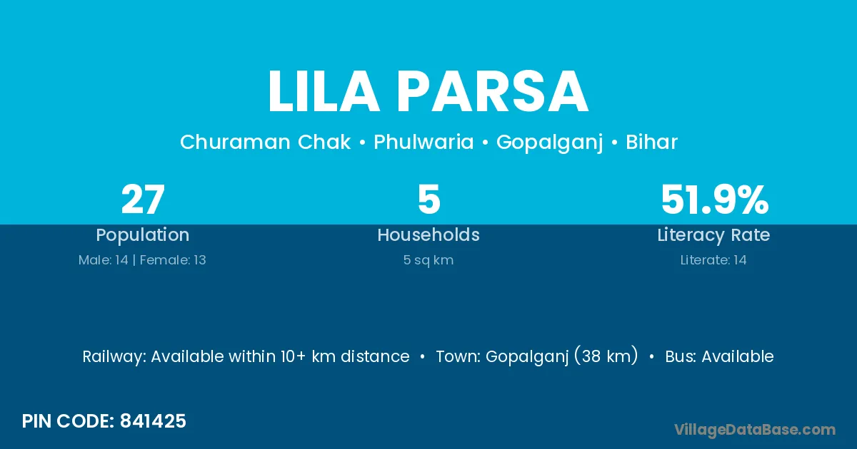 Gopalganj (38 km) is the nearest town to Lila Parsa village for major economic activities and is located approximately 38 km away.