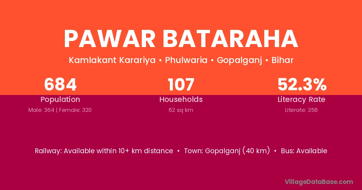 Gopalganj (40 km) is the nearest town to Pawar Bataraha village for major economic activities and is located approximately 40 km away.