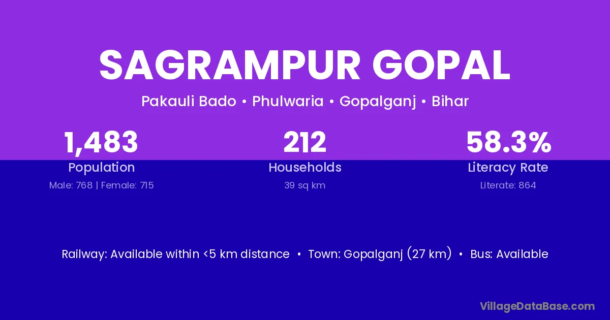Gopalganj (27 km) is the nearest town to Sagrampur Gopal village for major economic activities and is located approximately 27 km away.
