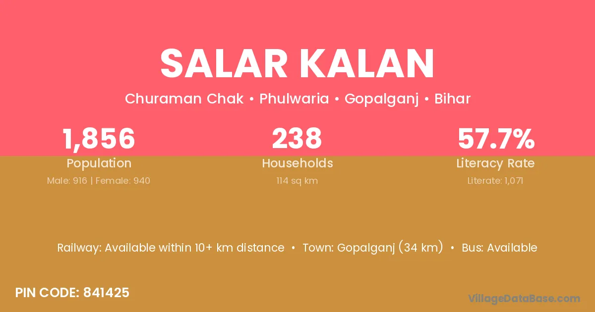 Gopalganj (34 km) is the nearest town to Salar Kalan village for major economic activities and is located approximately 34 km away.