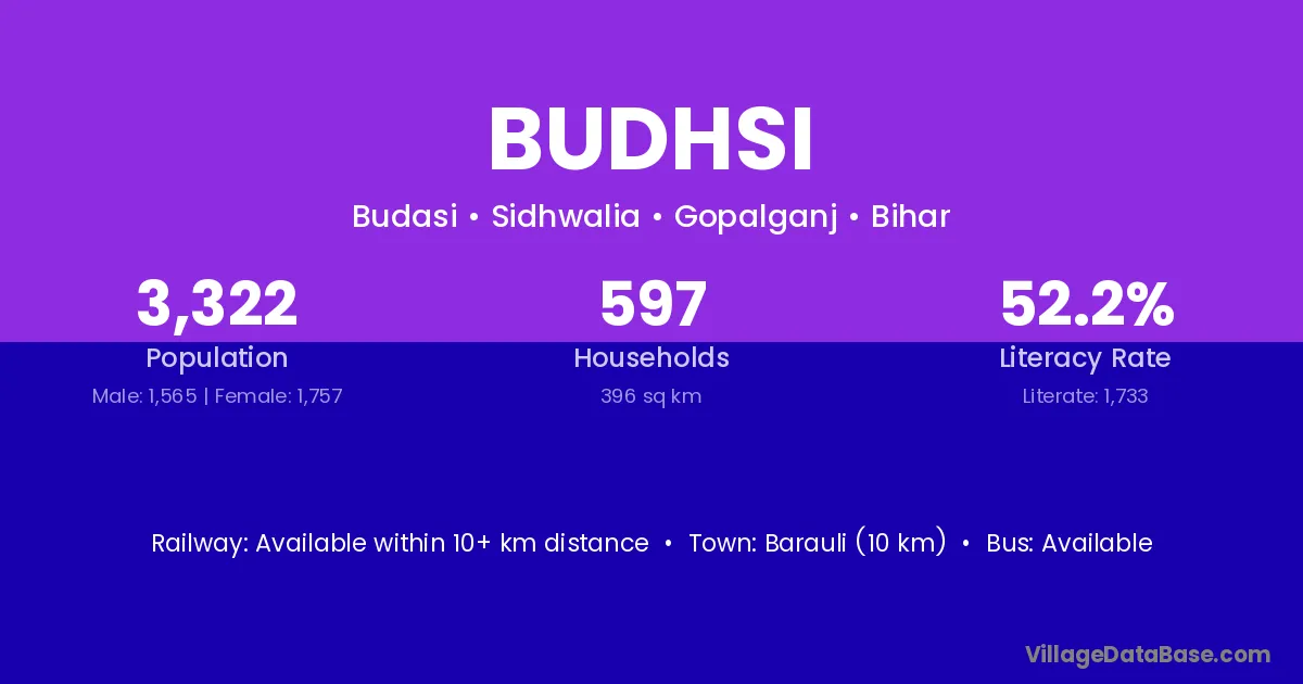 Barauli (10 km) is the nearest town to Budhsi village for major economic activities and is located approximately 10 km away.