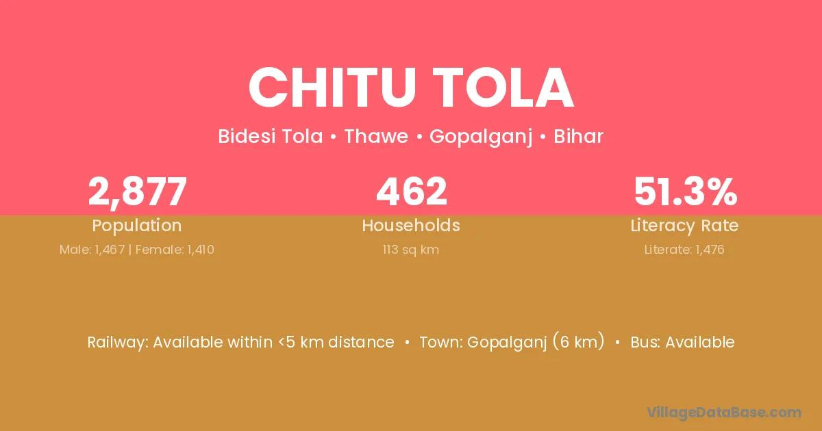 Gopalganj (6 km) is the nearest town to Chitu Tola village for major economic activities and is located approximately 6 km away.