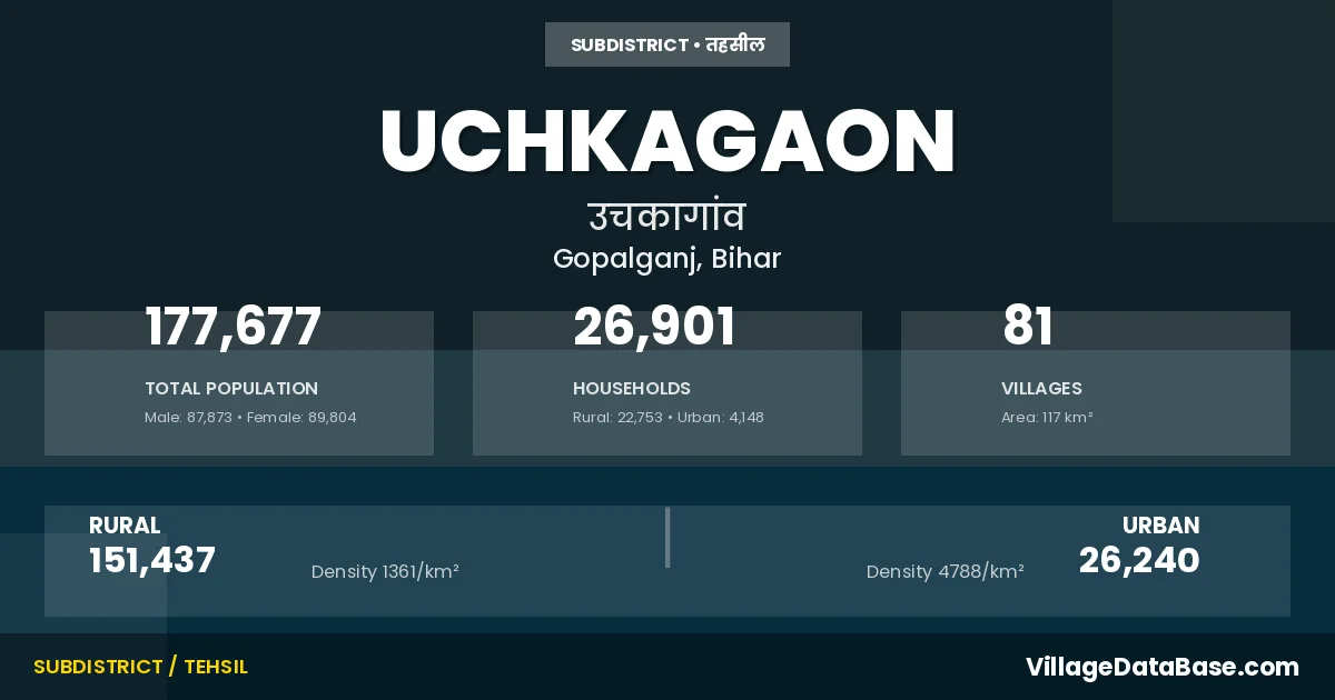 Uchkagaon is a town and Subdivision in the Gopalganj district of the Bihar. In India, a Subdivision is a subdivision of a district responsible for the administration and revenue collection of a specific area within the district. Subdivisions play a crucial role in the local governance structure, contributing significantly to the development and administration of their communities.