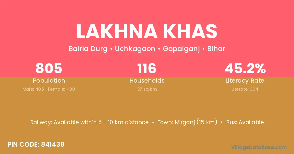 Mirganj (15 km) is the nearest town to Lakhna Khas village for major economic activities and is located approximately 15 km away.