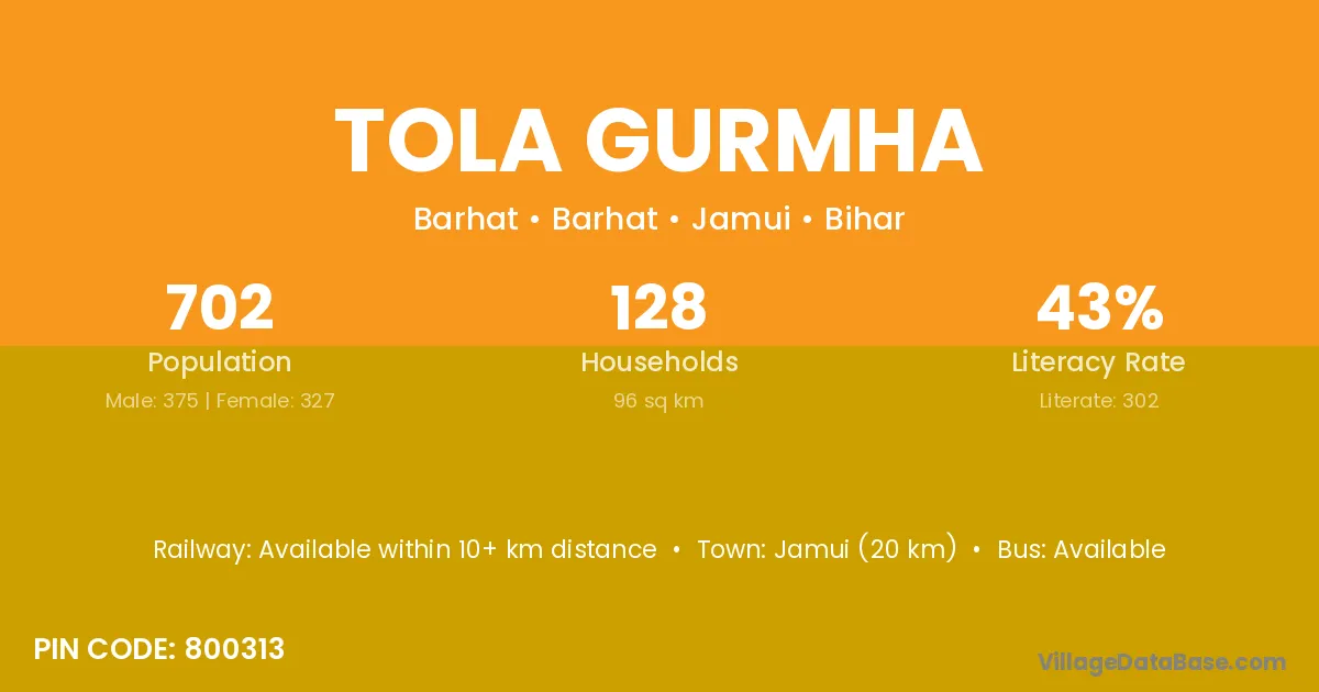 Jamui (20 km) is the nearest town to Tola Gurmha village for major economic activities and is located approximately 20 km away.