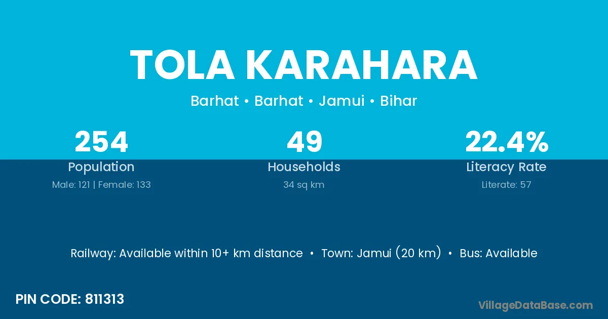 Jamui (20 km) is the nearest town to Tola Karahara village for major economic activities and is located approximately 20 km away.
