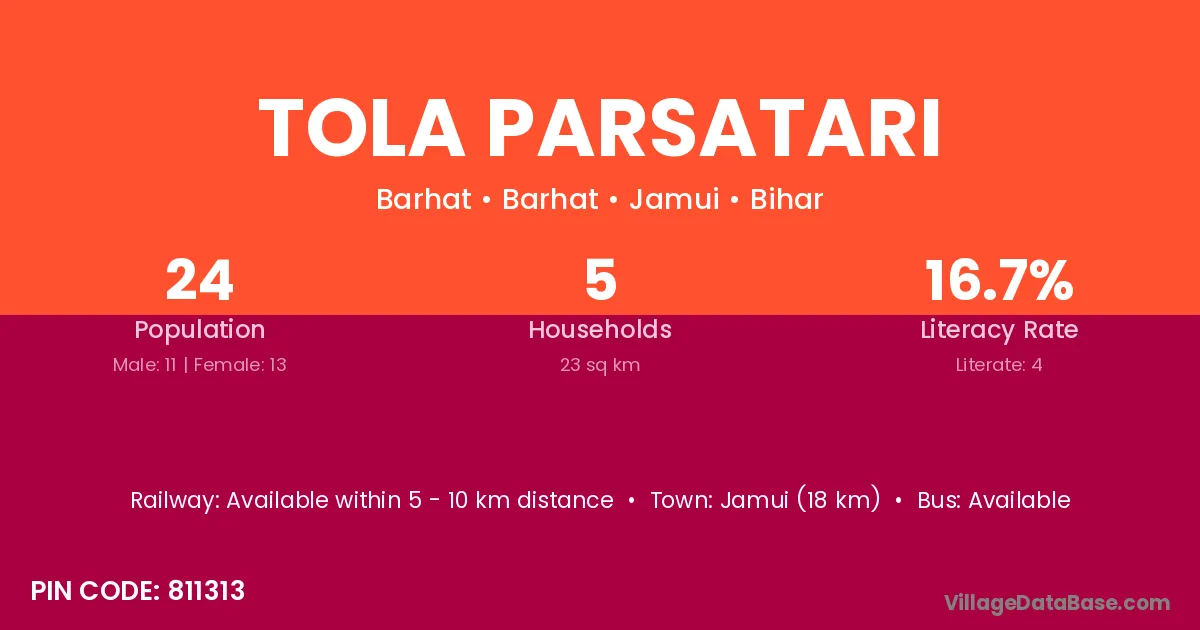Jamui (18 km) is the nearest town to Tola Parsatari village for major economic activities and is located approximately 18 km away.