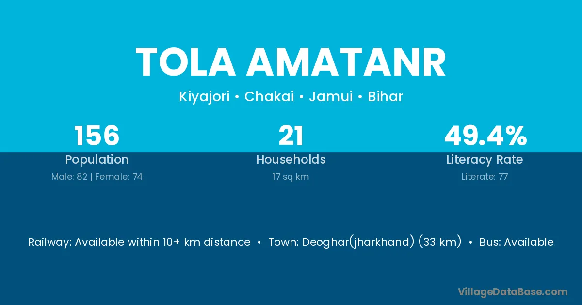 Deoghar(jharkhand) (33 km) is the nearest town to Tola Amatanr village for major economic activities and is located approximately 33 km away.