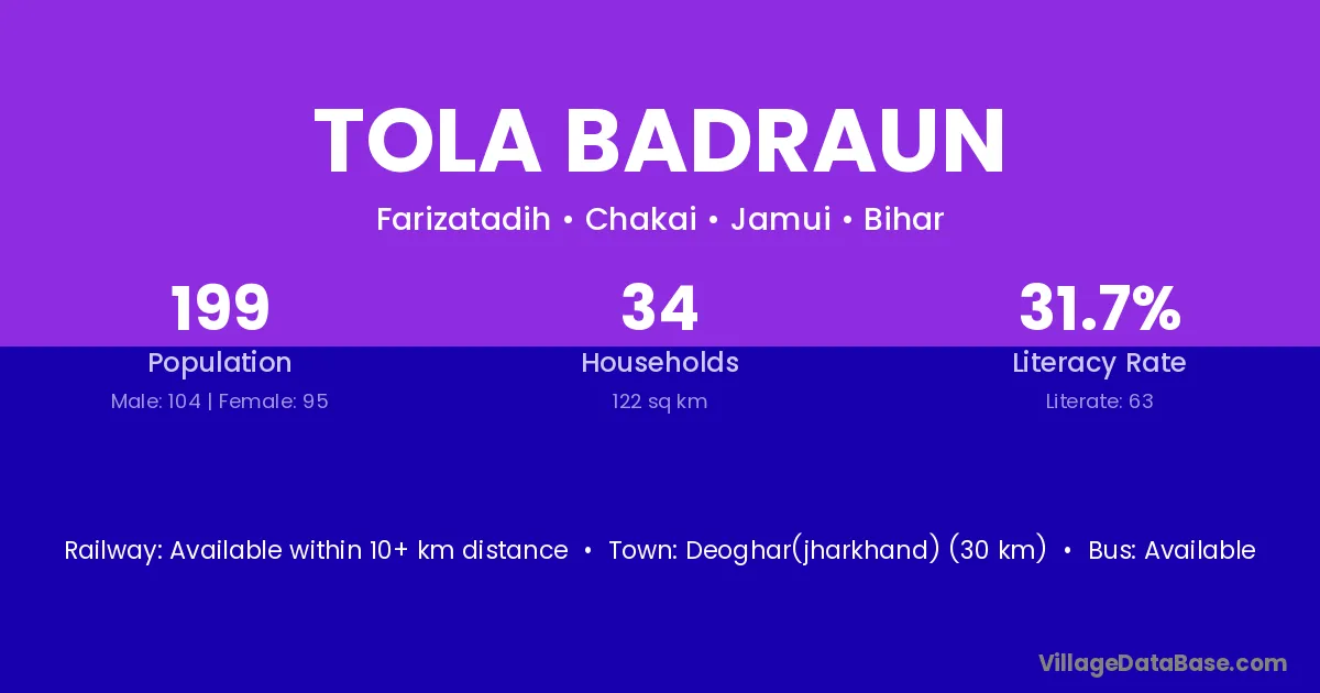 Deoghar(jharkhand) (30 km) is the nearest town to Tola Badraun village for major economic activities and is located approximately 30 km away.