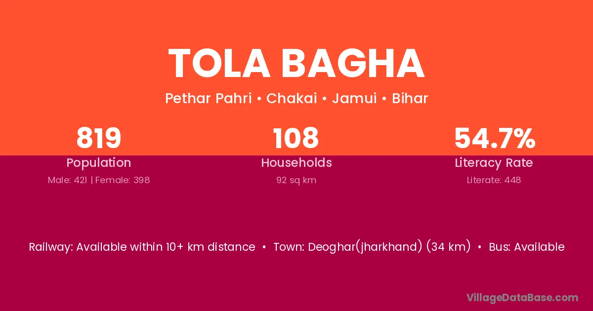 Deoghar(jharkhand) (34 km) is the nearest town to Tola Bagha village for major economic activities and is located approximately 34 km away.