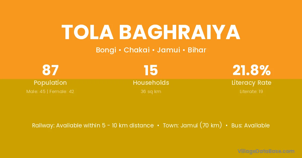 Jamui (70 km) is the nearest town to Tola Baghraiya village for major economic activities and is located approximately 70 km away.