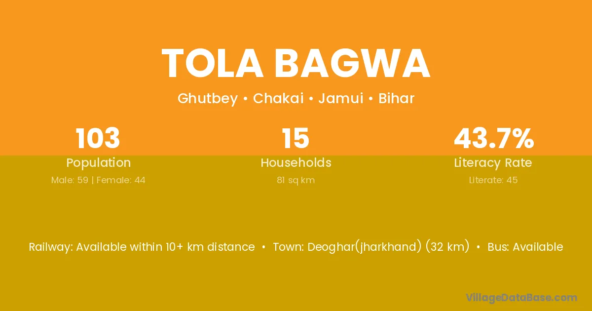 Tola Bagwa village has a total population of 103 people, of which 59 are males and 44 are females.