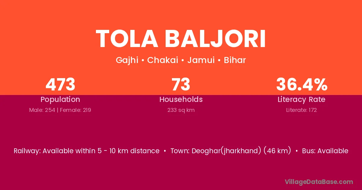Deoghar(jharkhand) (46 km) is the nearest town to Tola Baljori village for major economic activities and is located approximately 46 km away.