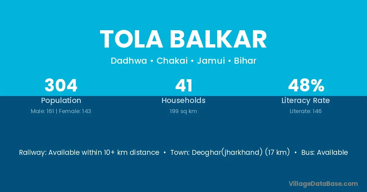 Deoghar(jharkhand) (17 km) is the nearest town to Tola Balkar village for major economic activities and is located approximately 17 km away.