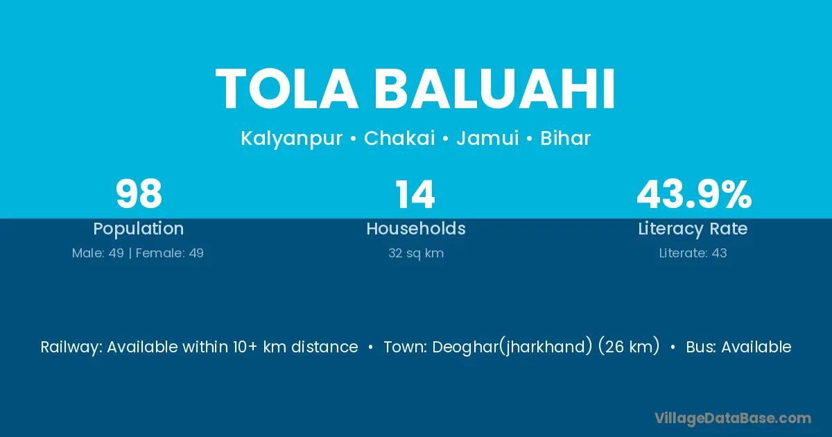 Deoghar(jharkhand) (26 km) is the nearest town to Tola Baluahi village for major economic activities and is located approximately 26 km away.