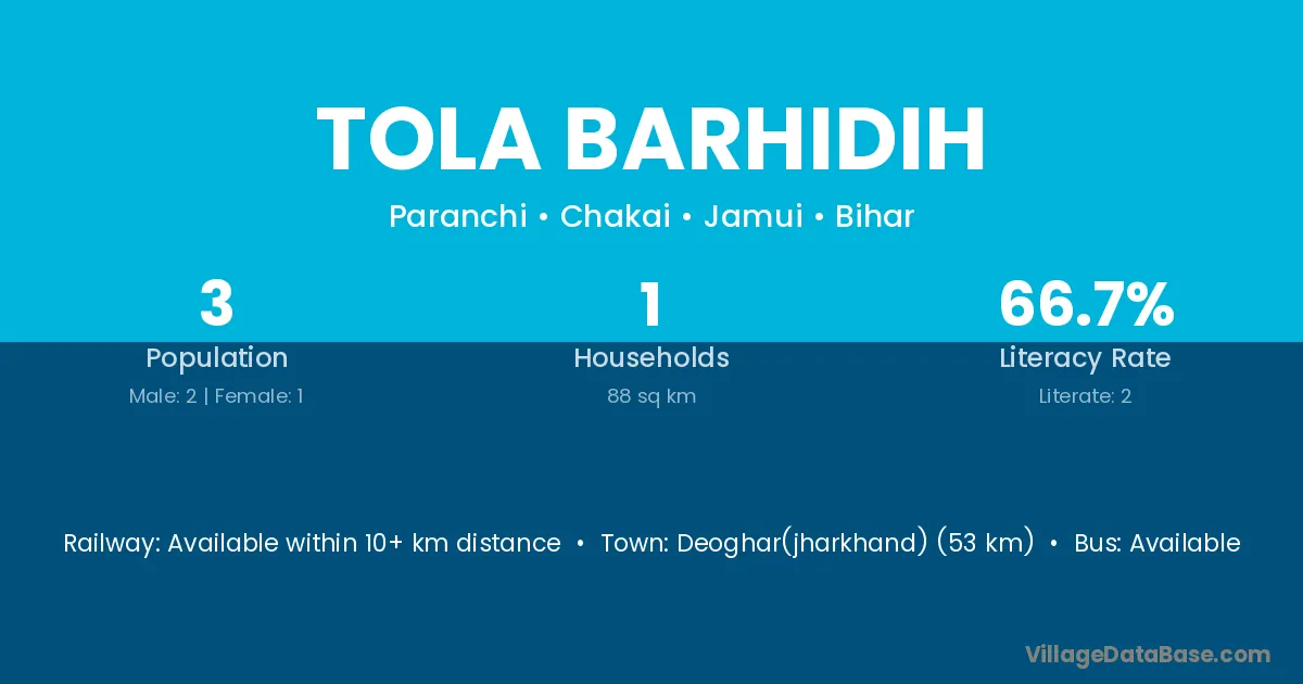 Deoghar(jharkhand) (53 km) is the nearest town to Tola Barhidih village for major economic activities and is located approximately 53 km away.