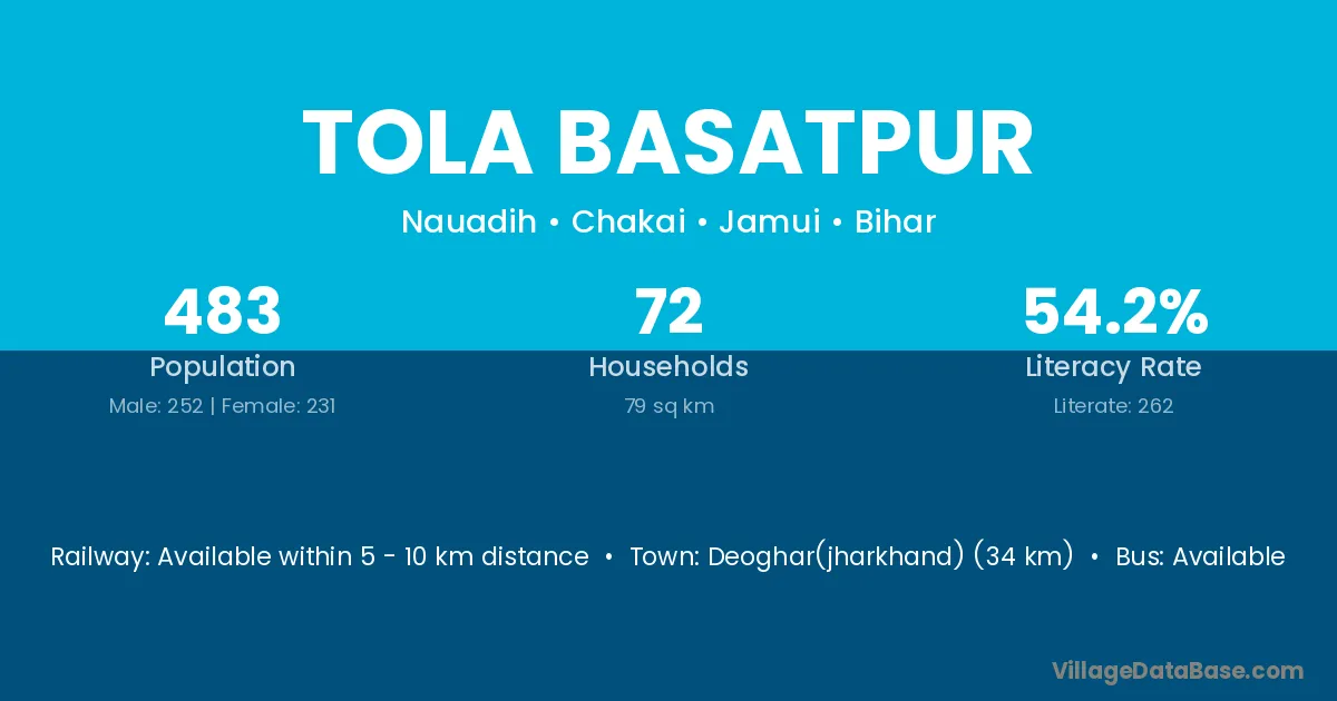 Deoghar(jharkhand) (34 km) is the nearest town to Tola Basatpur village for major economic activities and is located approximately 34 km away.