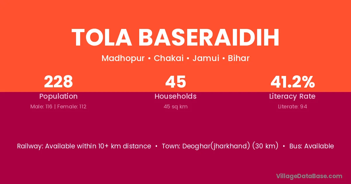 Deoghar(jharkhand) (30 km) is the nearest town to Tola Baseraidih village for major economic activities and is located approximately 30 km away.