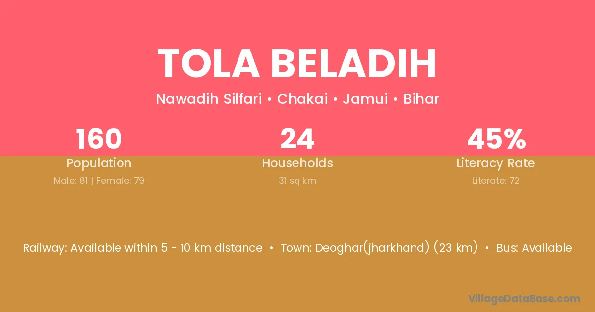 Deoghar(jharkhand) (23 km) is the nearest town to Tola Beladih village for major economic activities and is located approximately 23 km away.