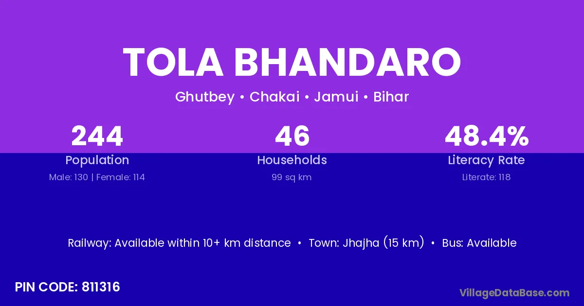 Tola Bhandaro village has a total population of 244 people, of which 130 are males and 114 are females.