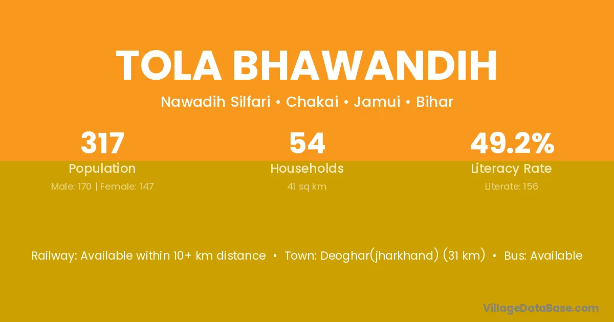 Tola Bhawandih village has a total population of 317 people, of which 170 are males and 147 are females.
