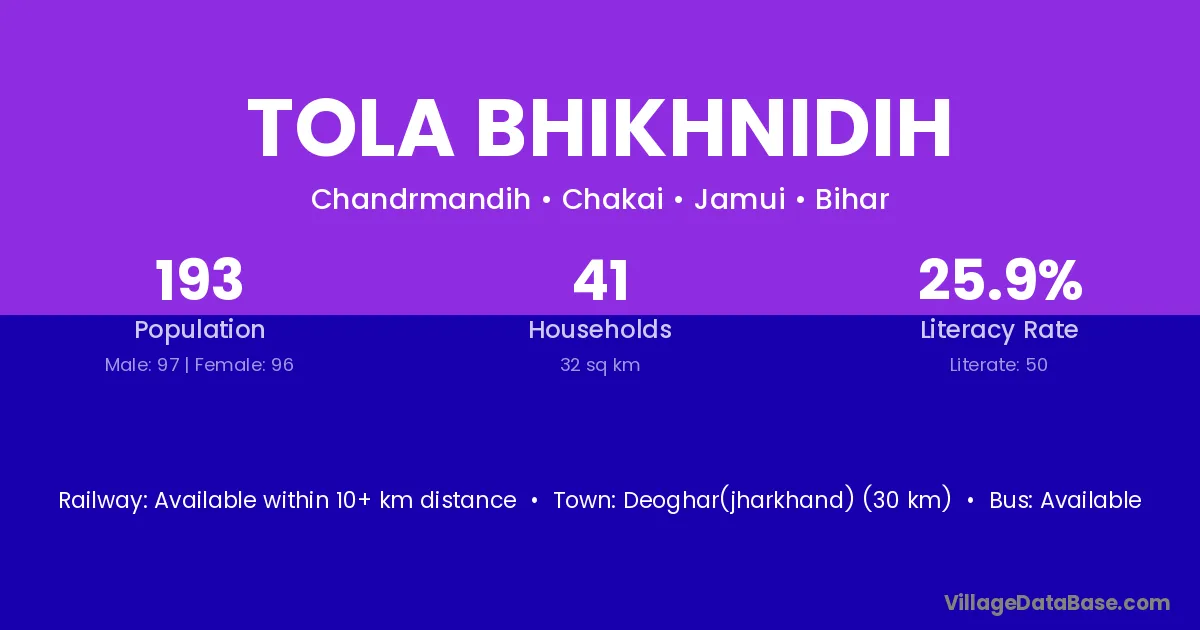 Tola Bhikhnidih village has a total population of 193 people, of which 97 are males and 96 are females.
