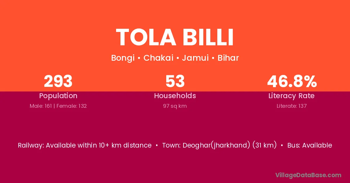 Deoghar(jharkhand) (31 km) is the nearest town to Tola Billi village for major economic activities and is located approximately 31 km away.
