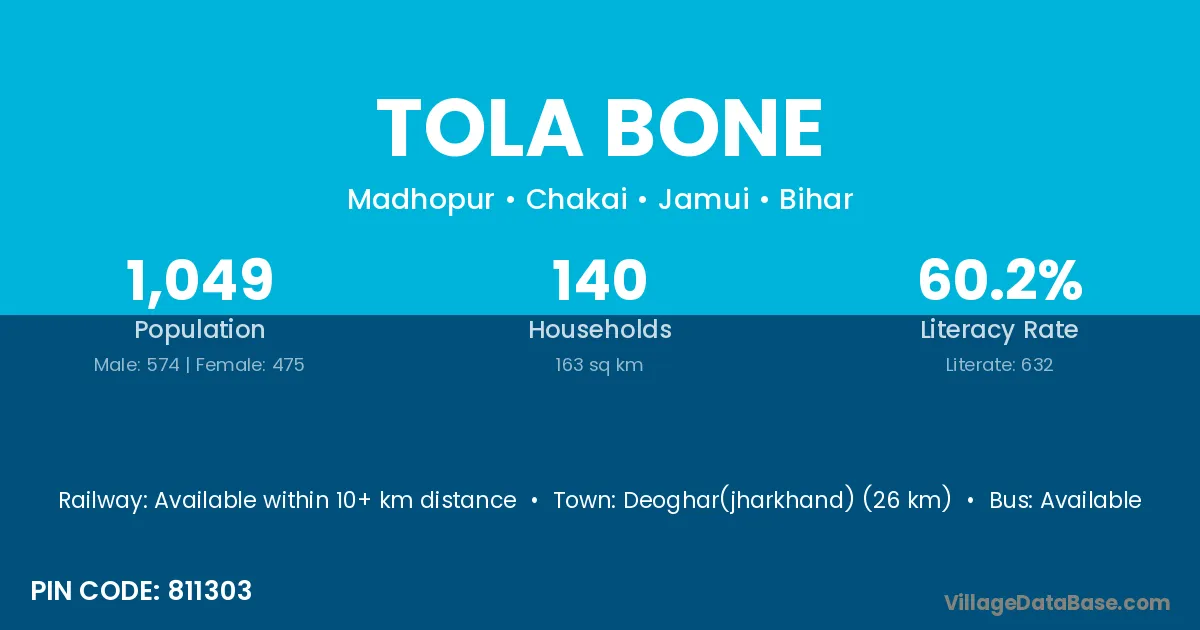 Deoghar(jharkhand) (26 km) is the nearest town to Tola Bone village for major economic activities and is located approximately 26 km away.