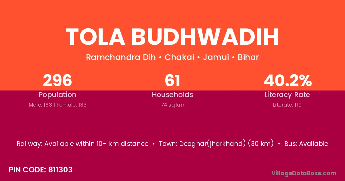 Deoghar(jharkhand) (30 km) is the nearest town to Tola Budhwadih village for major economic activities and is located approximately 30 km away.