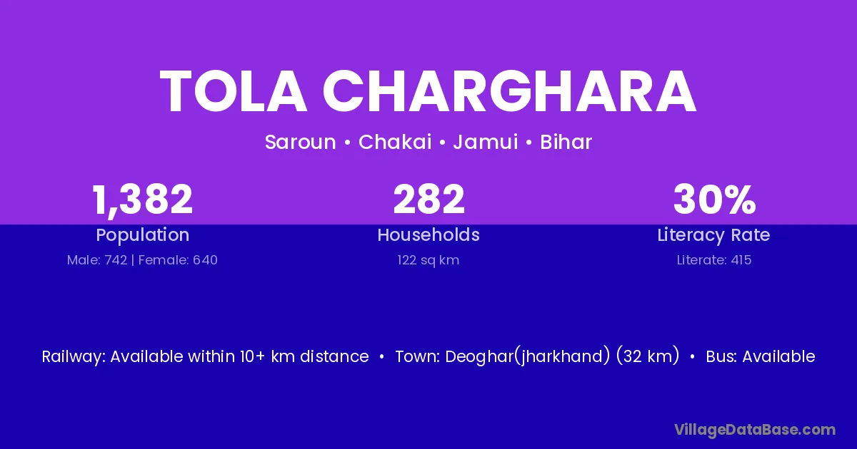 Deoghar(jharkhand) (32 km) is the nearest town to Tola Charghara village for major economic activities and is located approximately 32 km away.