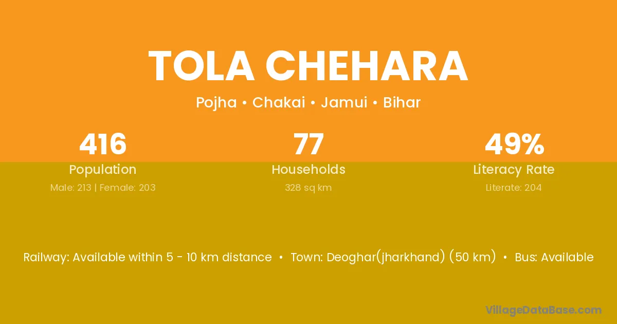 Deoghar(jharkhand) (50 km) is the nearest town to Tola Chehara village for major economic activities and is located approximately 50 km away.