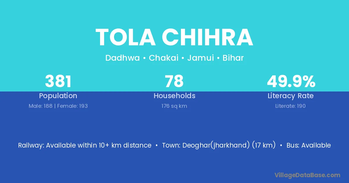 Deoghar(jharkhand) (17 km) is the nearest town to Tola Chihra village for major economic activities and is located approximately 17 km away.