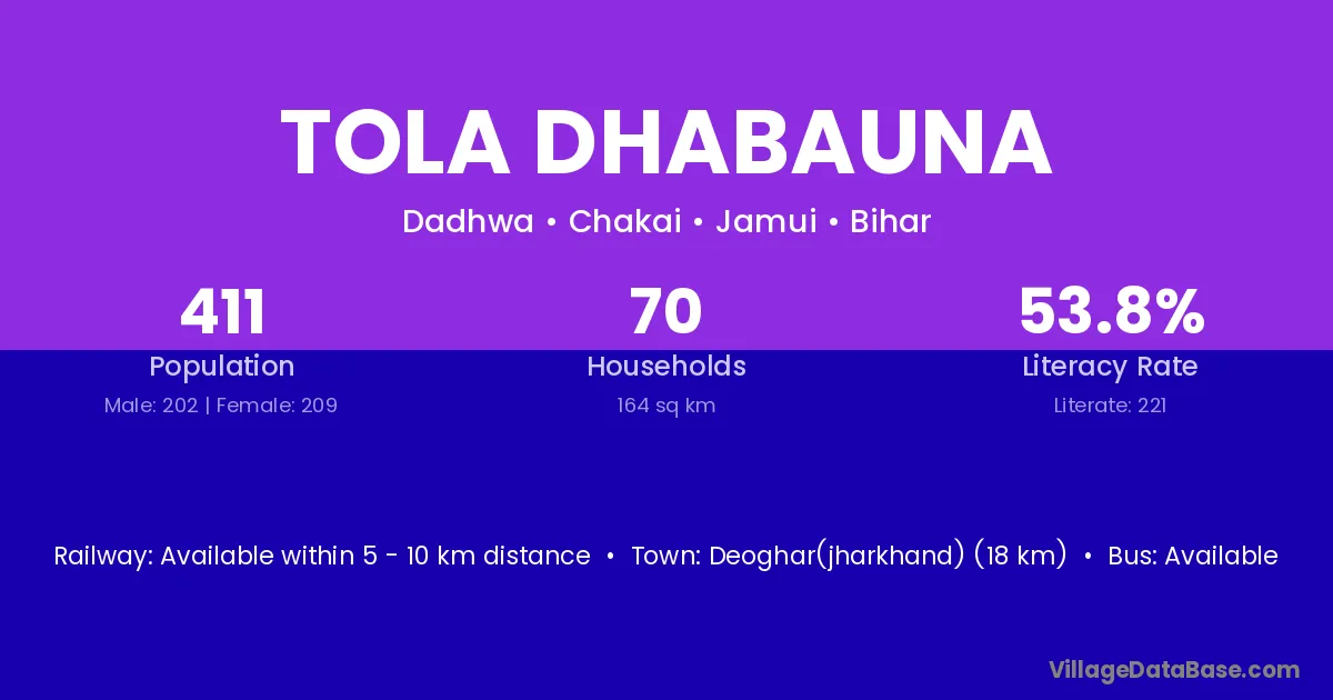 Deoghar(jharkhand) (18 km) is the nearest town to Tola Dhabauna village for major economic activities and is located approximately 18 km away.