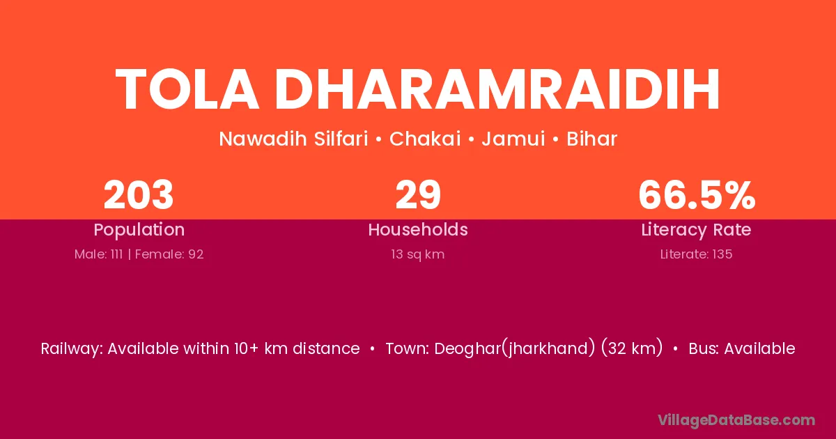 Deoghar(jharkhand) (32 km) is the nearest town to Tola Dharamraidih village for major economic activities and is located approximately 32 km away.