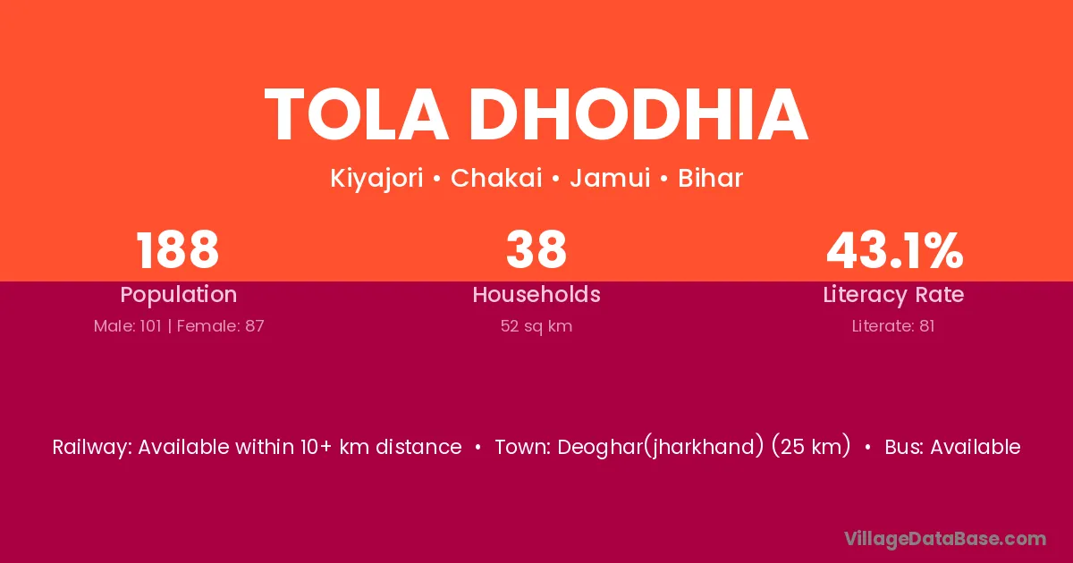 Deoghar(jharkhand) (25 km) is the nearest town to Tola Dhodhia village for major economic activities and is located approximately 25 km away.