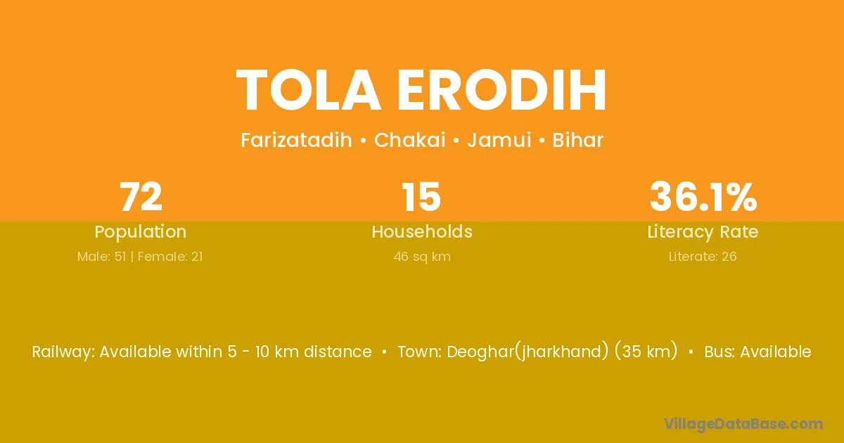 Deoghar(jharkhand) (35 km) is the nearest town to Tola Erodih village for major economic activities and is located approximately 35 km away.