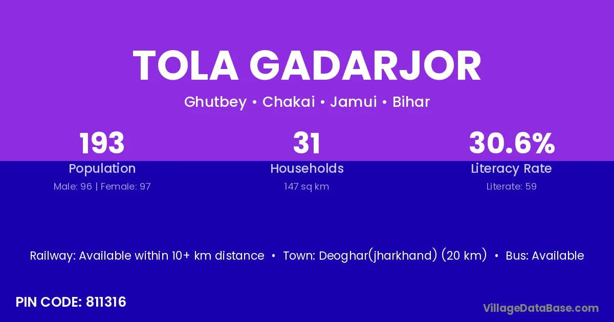 Deoghar(jharkhand) (20 km) is the nearest town to Tola Gadarjor village for major economic activities and is located approximately 20 km away.