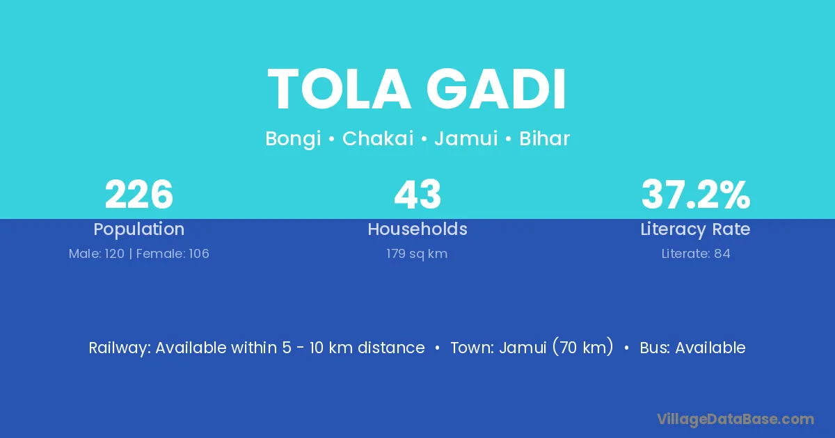Jamui (70 km) is the nearest town to Tola Gadi village for major economic activities and is located approximately 70 km away.