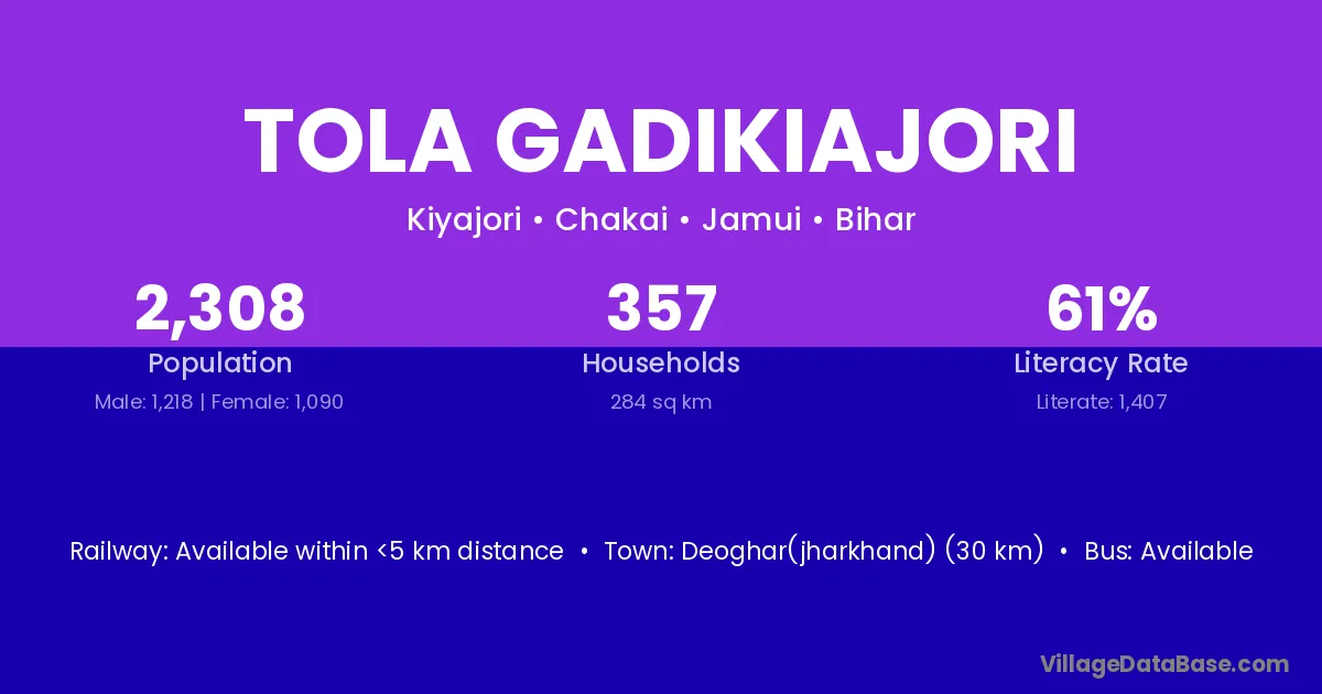 Deoghar(jharkhand) (30 km) is the nearest town to Tola Gadikiajori village for major economic activities and is located approximately 30 km away.